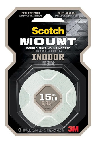 CINTA DE MONTAJE DOBLE CARA INTERIOR 1″ X 1.52 YARDAS -SOPORTA HASTA 6.8KG SCOTH 3M